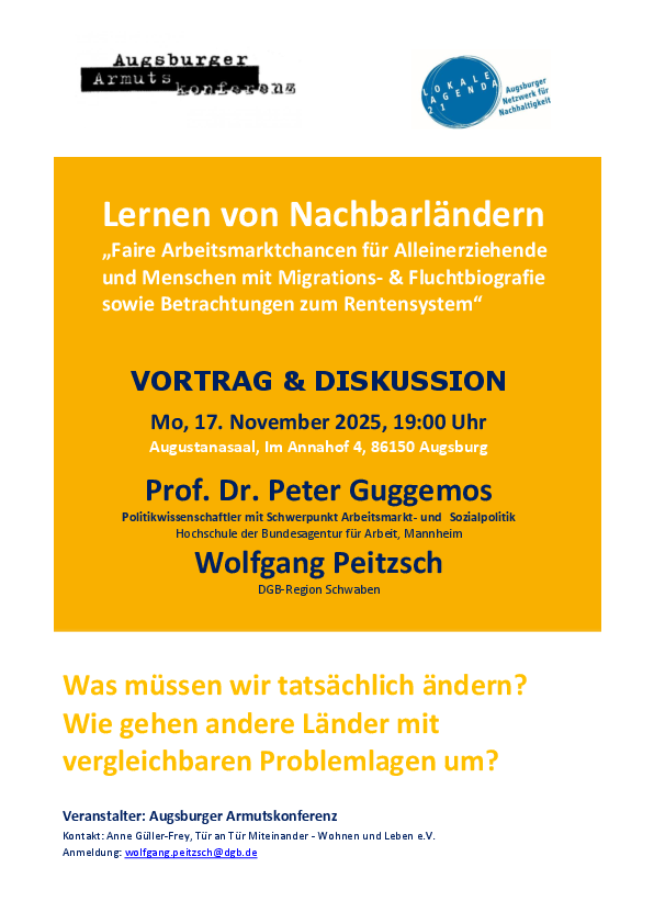 Am Montag, 17.11.25, um 19.00 Uhr veranstaltet die Augsburger Armutskonferenz im Augustanasaal, Annahof, in Augsburg einen Vortrag mit Prof. Dr. Peter Guggemos, Politikwissenschaftler mit Schwerpunkt Arbeitsmarkt und Sozialpolitik an der Hochschule der Bundesagentur für Arbeit, Mannheim. Thema sind die Arbeitsmarktchancen für Alleinerziehende und Menschen mit Migrations- und Fluchtbiografie sowie Betrachtungen zum Rentensystem. Hierzu werden u.a. positive Praktikten aus Nachbarländern vorgestellt. Anschließend besteht die Möglichkeit zur Diskussion.
